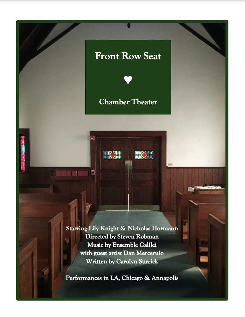 Rarely is a Chamber Theater production so deeply collaborative and infused with the energy and insights of the whole company - Front Row Seat is just that. This tale of the survival of a small church in Baltimore started as a book, became a play, and was brought forth in a series of workshops in 2023. With legendary actors Lily Knight and Nicholas Hormann, shaped by Steve Robman, one of the most innovative and successful directors of new plays in Los Angeles, and graced with some of the finest Irish musicians in America, this new work by Carolyn Surrick is a remarkable (and beautiful) look at the nature of faith and community in 2020, as the pandemic and political instability darkened the world.